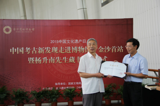 在十大考古新发现走进博物馆的启动仪式上,中国古文字专家杨升南先生向金沙遗址博物馆捐赠了他长期珍藏的书籍。这些藏书共7000余册,包括甲骨文等古文字研究资料,历史文献、研究文集以及各类工具书、丛书等。其中不乏珍贵图书,如《甲骨文合集》全套(中华书局1978年版)、《甲骨文合集释文》(中国社会科学出版社、中华书局、语文出版社1992年版)、《中文大辞典》(中华文化研究所1968年版)、《四部精要》(上海古籍出版社1993年版)等。