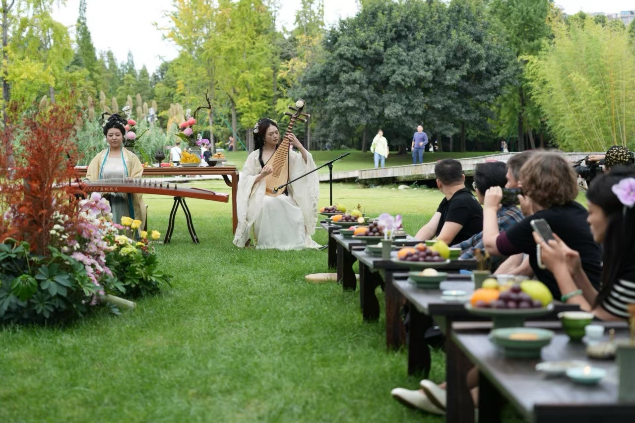 五场“寻香金沙・青韵雅集”活动尤其令人难忘,不仅场场座无虚席,现场更是充满欢声笑语。10月6日中秋当天,遗迹馆草坪化身雅集现场,参与者除了通过簪花、净手、品茗、焚香、听琴、制香和飞花令互动,感受宋代生活美学,还能体验焚金兔望月香、祈福月神等限定环节,为自己和家人祈福。值得一提的是,来自德国的游客康妮和朋友也饶有兴致地参与了这场活动,对她来说,亲手打制香篆、与中国人对吟德国诗篇,这些都是独特又难忘的体验。