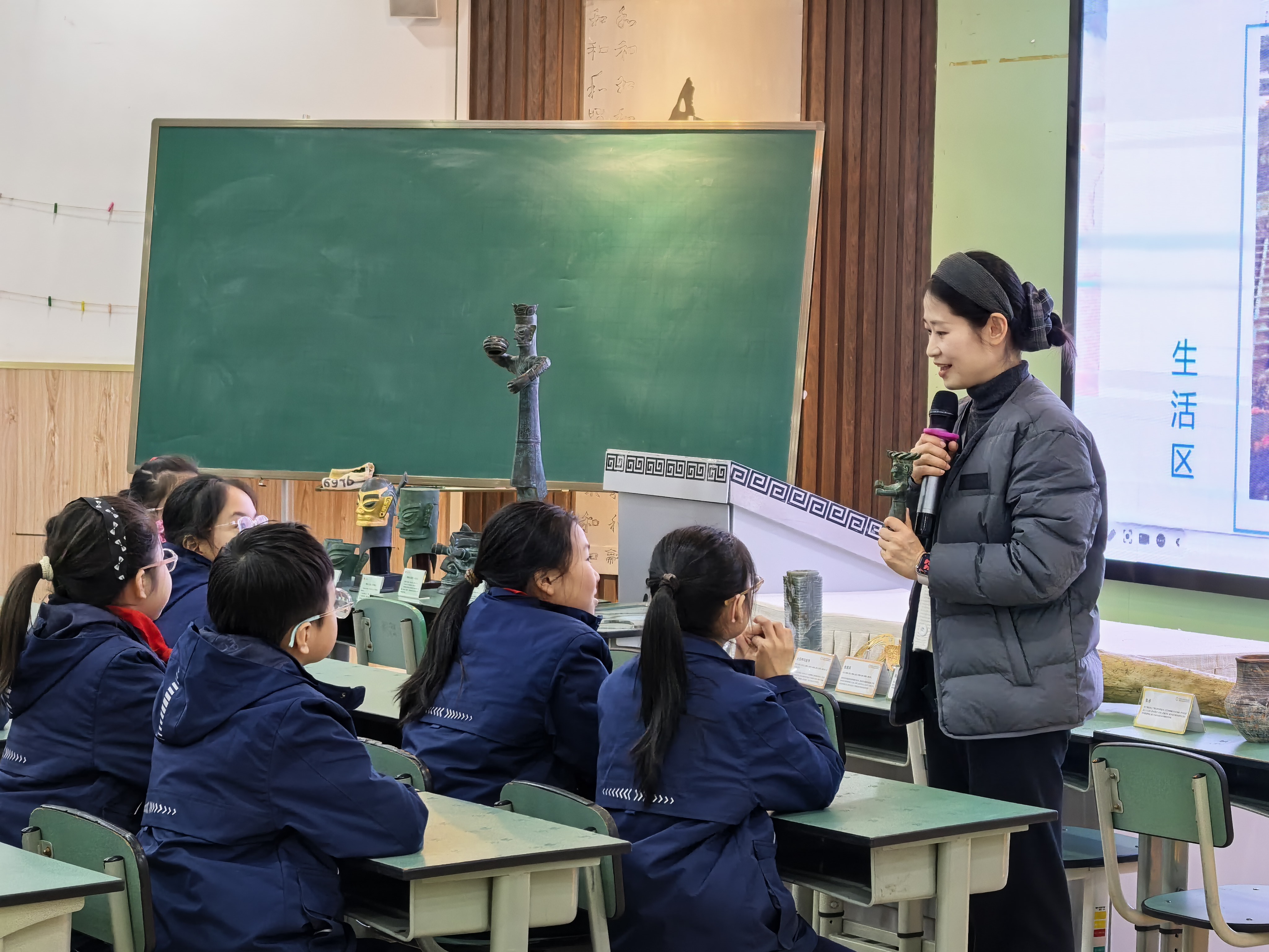 问及同学们对课堂的感受,颜子翔同学说到:“我感觉非常震撼,三星堆博物馆和金沙遗址博物馆的文物都非常精致,做工很精美,希望金沙遗址博物馆早日开馆,去现场参观”。曾在金沙遗址博物馆担任小小讲解员的余音希则表示:“这堂课让我了解到三星堆和金沙文物的联系和相似性,还有金沙的发现让成都的历史提前到距今三千年前。”