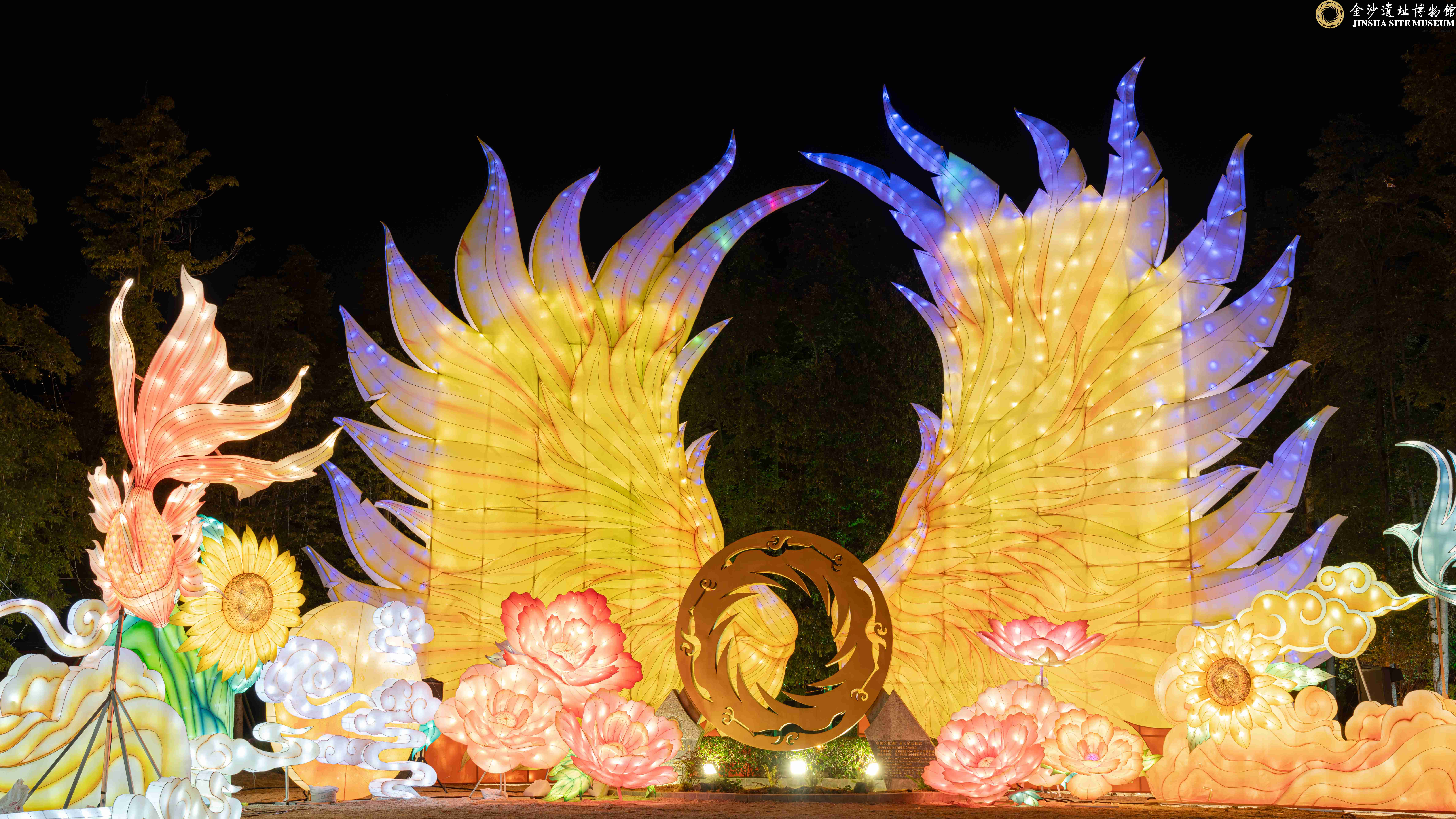 “‘太阳之光’光影艺术展”——在金沙国家考古遗址公园的广袤园区里,搭建12组大型灯组和数十余组中小型灯组,其中有6组超10米高的特大型灯组,以“古蜀文化”“遗产大观”“太阳崇拜”“福蛇迎春”四大板块,点亮超4000平米古蜀家园,为观众呈现一场跨越时空的光影盛宴。