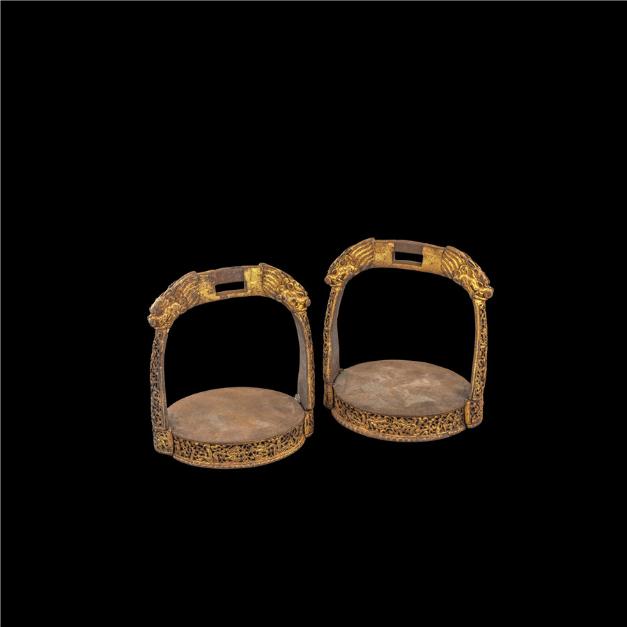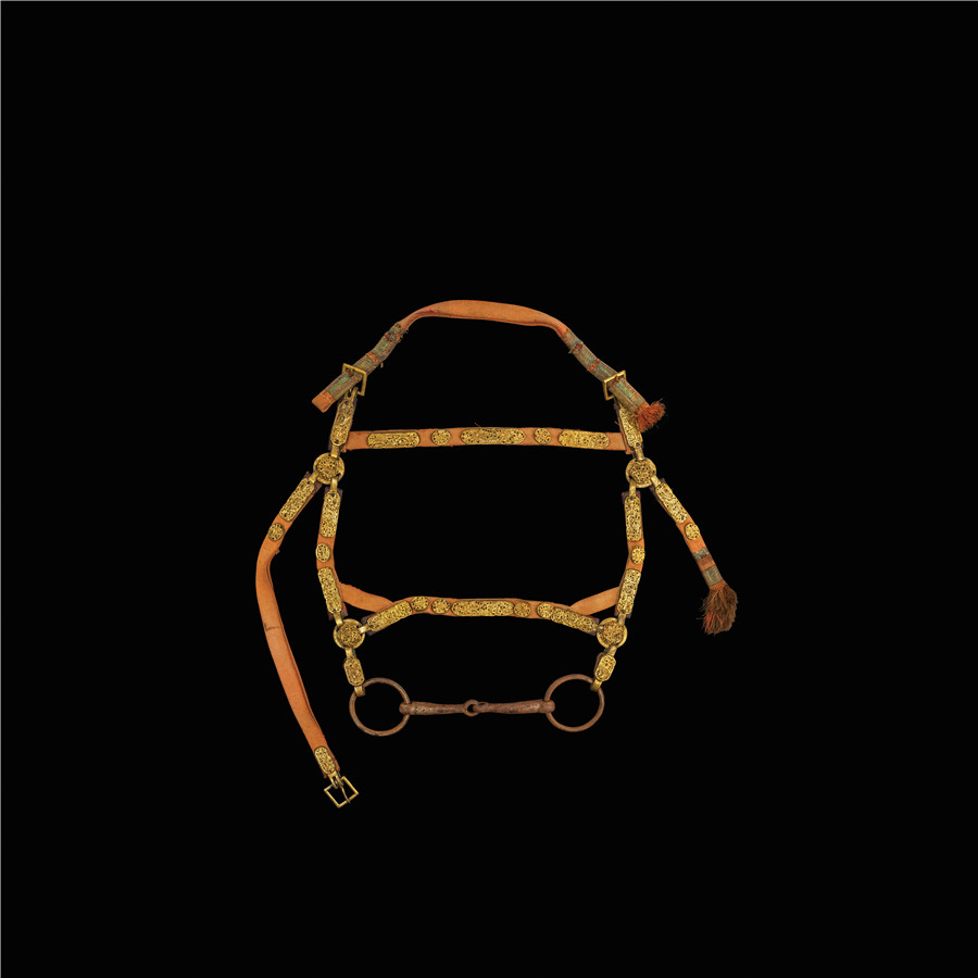 此套马具包括马鞍、马镫、辔头和铃铛,采用镂雕、鋄金工艺制造而成。