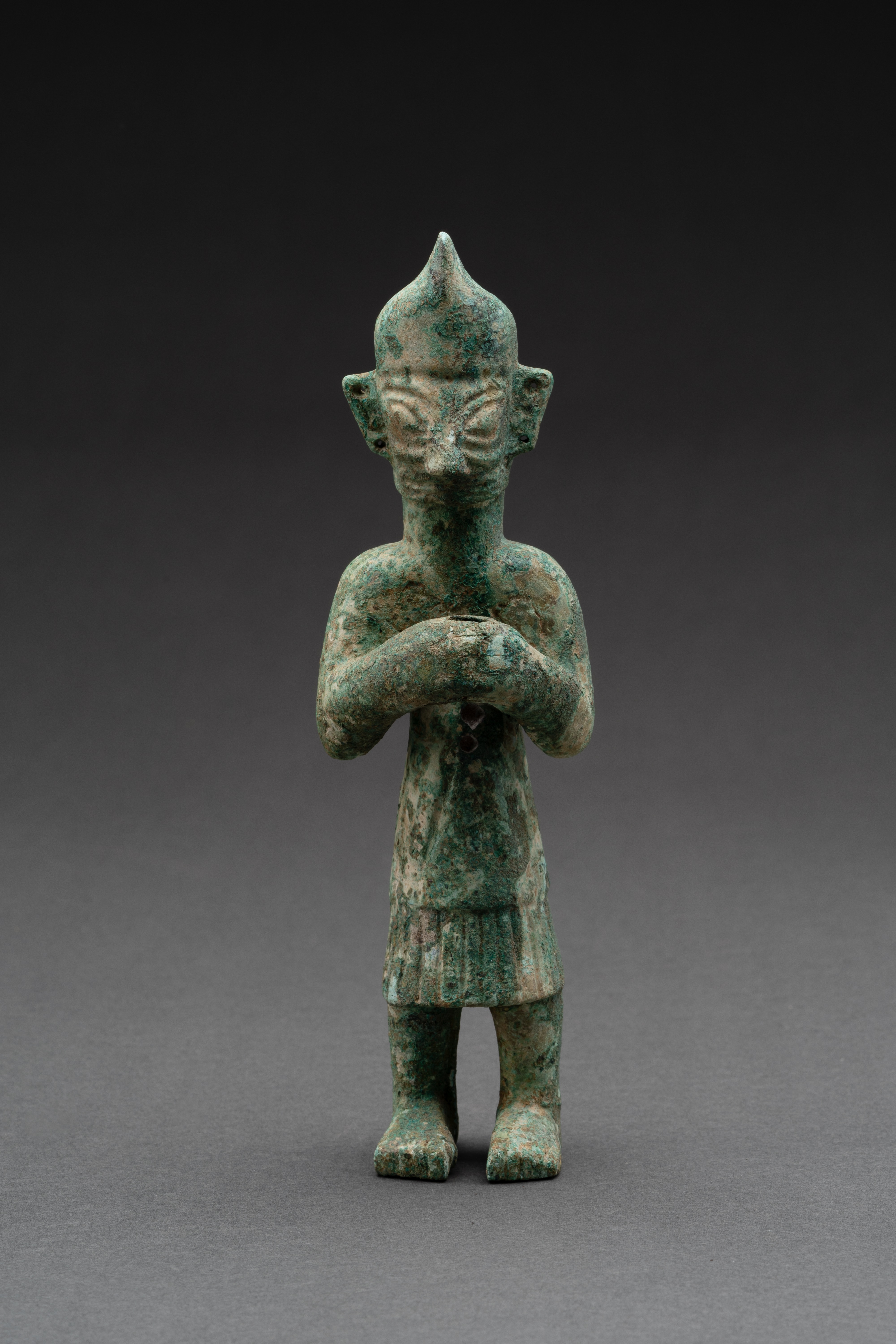 戴尖帽立人像高不过 20 厘米,戴尖头冠,身着长袍,赤足而立。双眼凸起,凝神所思,双肘下垂两手自然抬起作抱握状,估计原或握有某种仪仗用器。其整体形象简练而有趣,观者戏称其颇似经典动画形象“奥特曼”。
