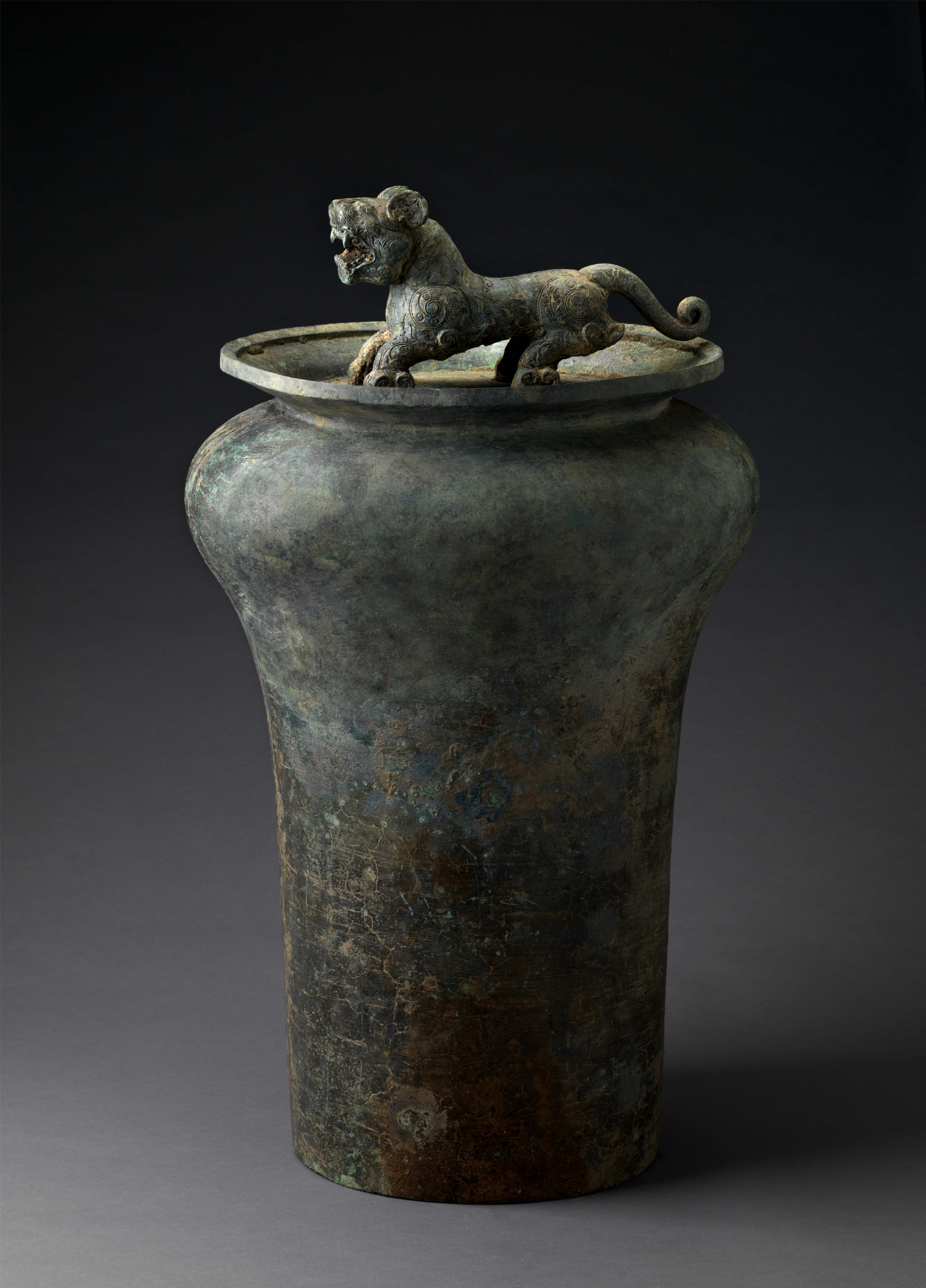 通高85厘米,肩径44厘米。纽长32厘米,宽8厘米。錞面作椭圆形盘口状,面上铸有心纹等三个巴蜀图符,肩部中空。纽为虎形,虎口大张,倨牙翘尾。虎身阴刻卷云纹、饕餮纹等纹饰。