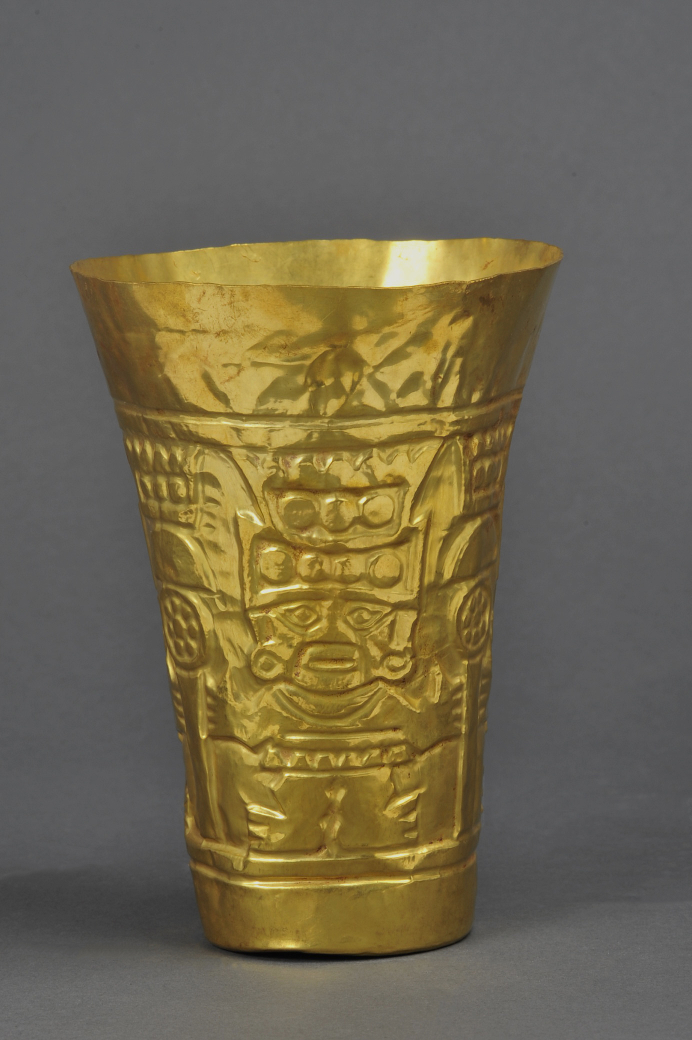 仪式用具,由一整片黄金片捶打制成,杯身上展示了多名西坎贵族,每人都戴着精致的头饰,面朝正前方站成一排。西坎金匠制作了许多有着不同装饰图案的金制杯子,上面常有凸出的祭祀物品和人物。