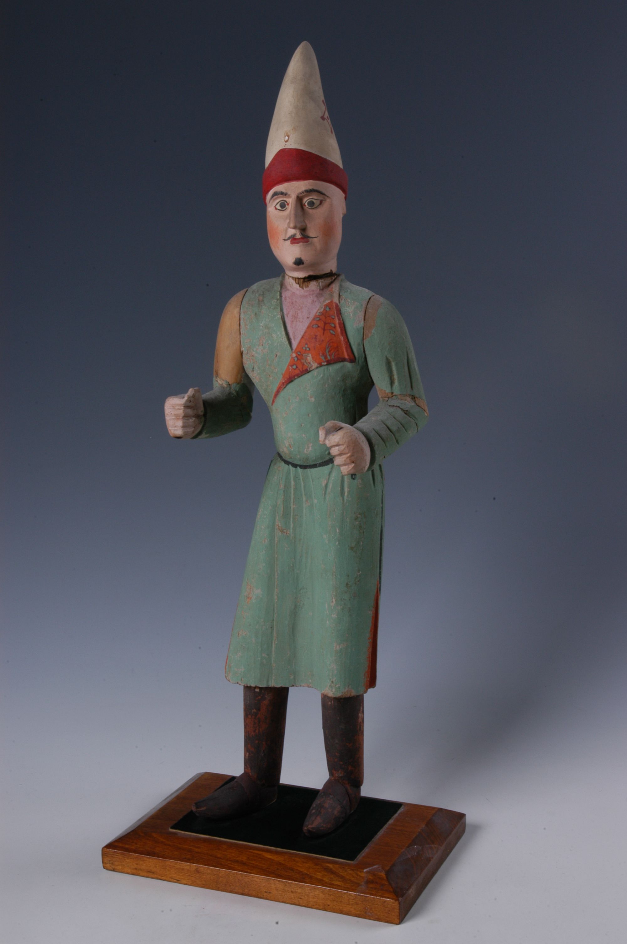 木俑为一胡人男子像,其头戴尖顶折沿白毡帽,身着绿色掩襟长袍,足蹬高腰皮靴,深目高鼻、双眼圆睁,炯炯有神,面部丰满圆润,胡须微翘。两小臂抬至胸前,双手攥紧,作握绳牵驼状,显得英俊、坚毅,显示了乐观自信的民族性格。该俑先分段雕刻,然后胶合成型再施以彩绘。制作技法精湛,艺术风格鲜明,具有很强的写实性。另外,在中原地区出土的一些唐三彩,也可见到身穿这种翻领胡服的人物俑。