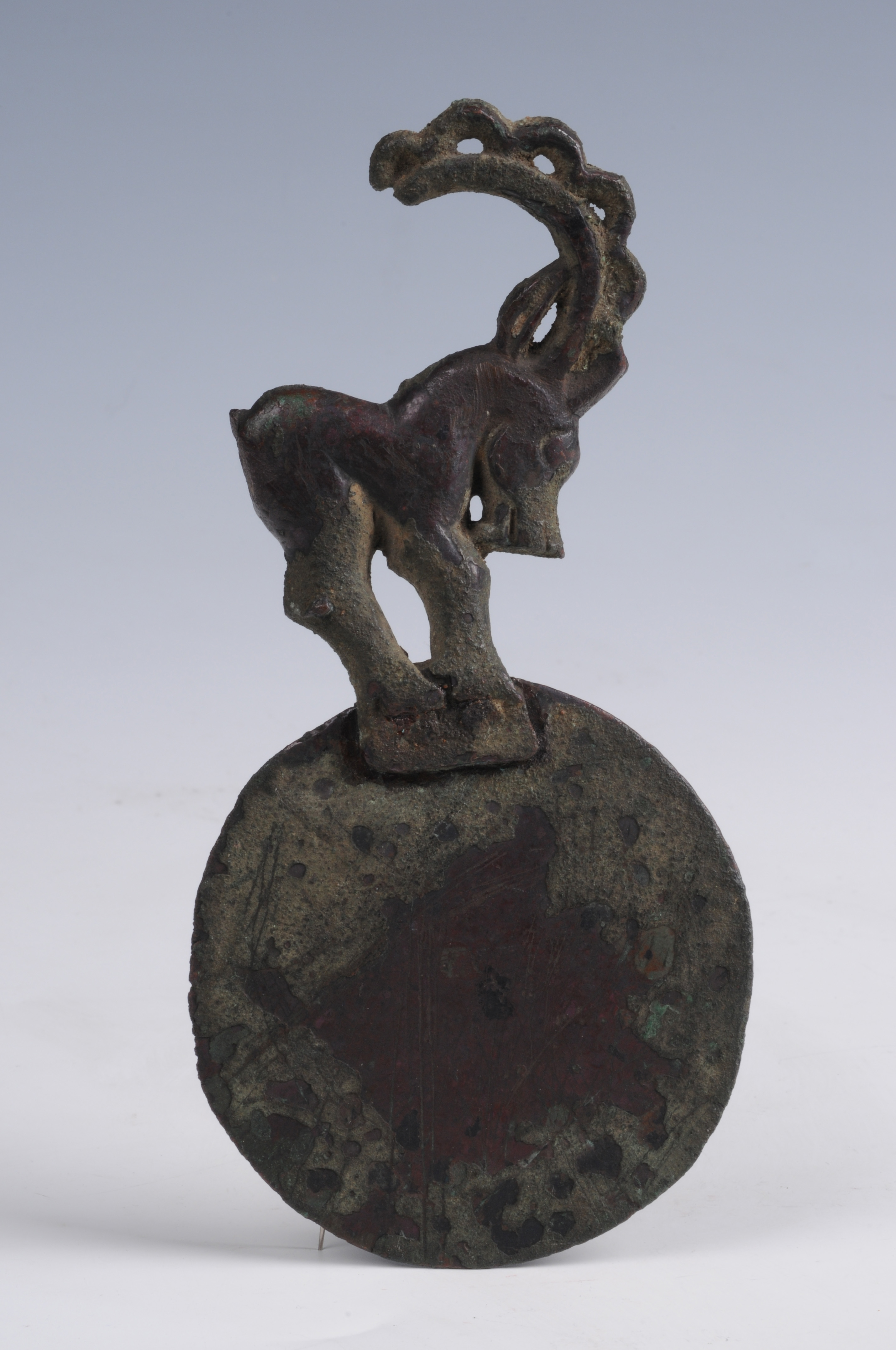 铜镜用青铜铸成,镜面呈圆形,素面无纹饰。镜缘焊接一只北山羊,耸臀、低首,大角呈波浪状向后弯曲成半圆形。铜镜造型古拙简朴,表现了天山北麓游牧民族的风格特色。