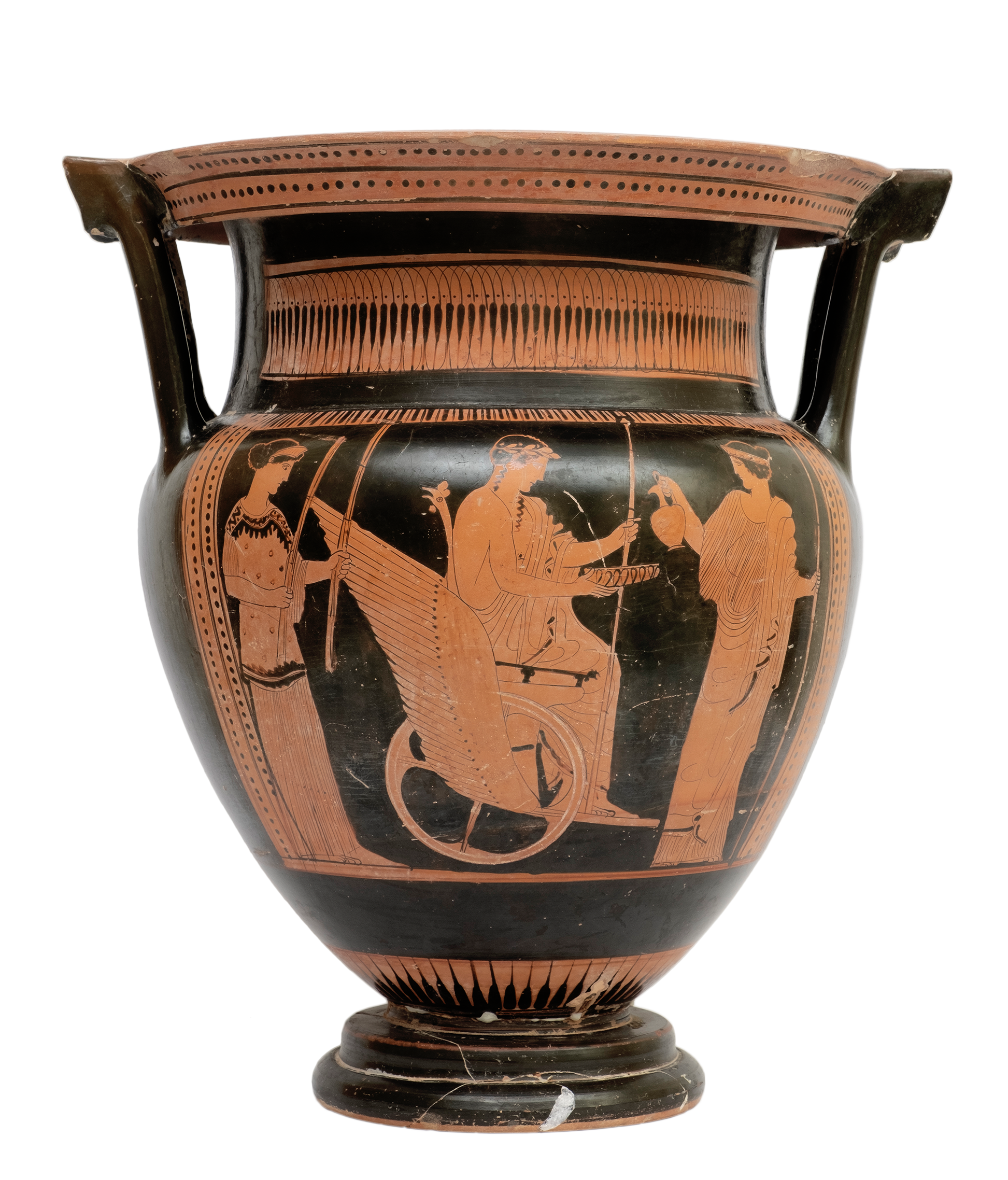 瓶画描述了英雄特里普托勒穆乘坐带翼战车准备离开,而德墨忒耳和她的女儿珀耳塞福涅在送别的场景。根据神话,德墨忒耳赐予英雄一辆由翼蛇拉动的战车作为礼物,同时向他传授谷物种植术,英雄得以周游世界,并将神的礼物分享给所有人。